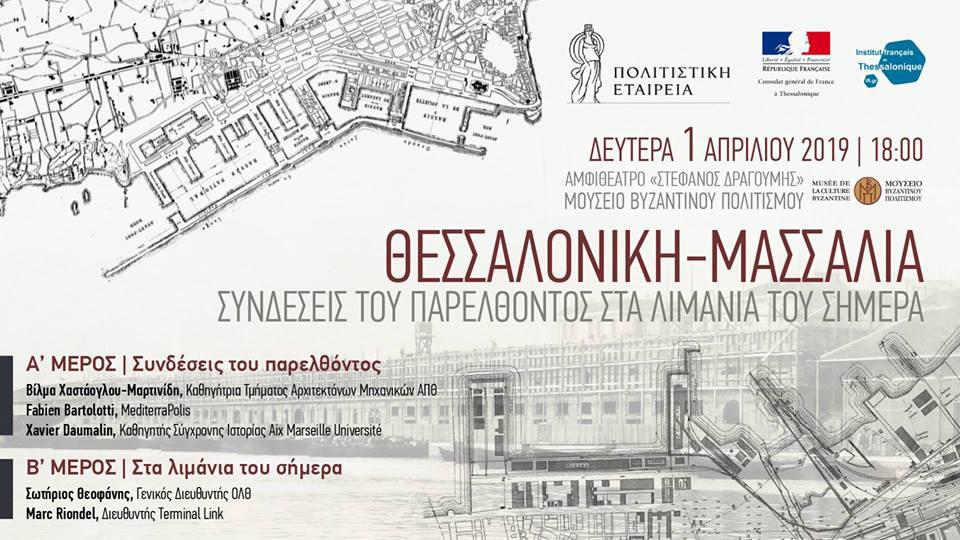 Σε μία μεταβατική εποχή για το λιμάνι Θεσσαλονίκης, η Πολιτιστική Εταιρεία Επιχειρηματιών Βορ. Ελλάδος σε συνεργασία με το Institut français de Thessalonique αναζητούν τις συνδέσεις του παρελθόντος και του μέλλοντος του λιμανιού της πόλης, με τη Γαλλία και το λιμάνι της Μασσαλίας. Ειδικοί ομιλητές, παρουσιάζουν την ιστορική σύνδεση του λιμανιού με την κατασκευαστική δραστηριότητα των Γάλλων του τέλους του 19ου αιώνα, αλλά και τα νήματα που το συνδέουν με το αντίστοιχο λιμάνι της Μασσαλίας.