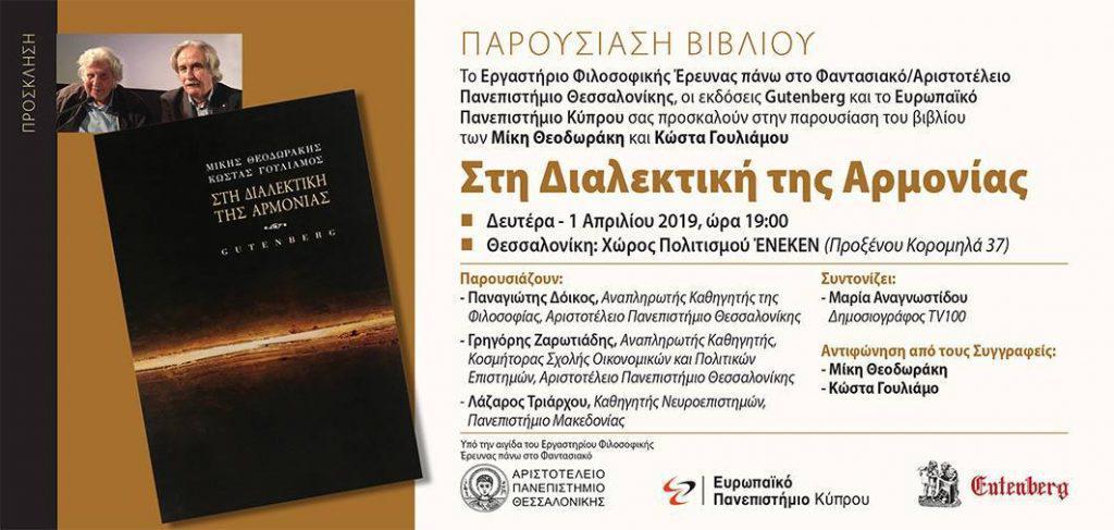 Το βιβλίο που συνέγραψαν ο Μίκης Θεοδωράκης και ο Κώστας Γουλιάμος Πρύτανης του Ευρωπαικού Πανεπιστημίου της Κύπρου με τίτλο “Στη Διαλεκτική της Αρμονίας “ θα παρουσιαστεί στη Θεσσαλονίκη σε εκδήλωση που θα πραγματοποιηθεί την 1 Απριλίου. Την εκδήλωση διοργανώνουν το εργαστήριο Φιλοσοφικής Έρευνας πάνω στο Φαντασιακό του ΑΠΘ ,οι εκδόσεις GUTENBERG,και το Ευρωπαικό Πανεπιστήμιο Κύπρου.