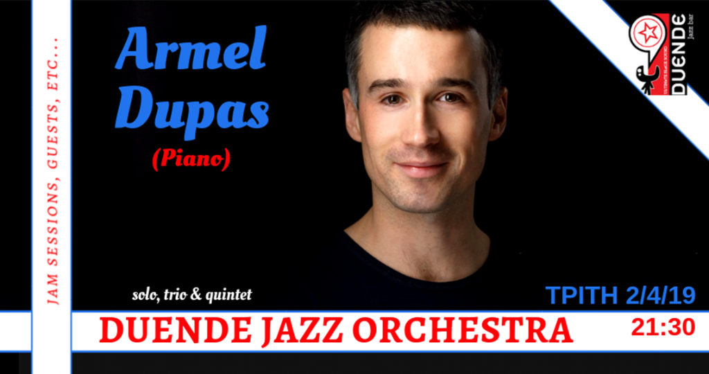 Οι κύριοι Γιάννης Οικονομίδης, Κοσμάς Στεφανίδης, Λάκης Τζήμκας και Αλέκος Σπανίδης υποδέχονται στη σκηνή του Duende Jazz Bar έναν από τους πιο δημιουργικούς πιανίστες της Γαλλίας. Ο πιανίστας & συνθέτης Armel Dupas μεγάλωσε μέσα σε μια οικογένεια μουσικών, πράγμα που τον οδήγησε αβίαστα να ακολουθήσει τον ίδιο δρόμο. Την Τρίτη 2 Απριλίου, θα απολαύσουμε τον Armel Dupas (σε σόλο ,τρίο και κουιντέτο φόρμες) με την πολύτιμη συμβολή της Duende Jazz Orchestra!