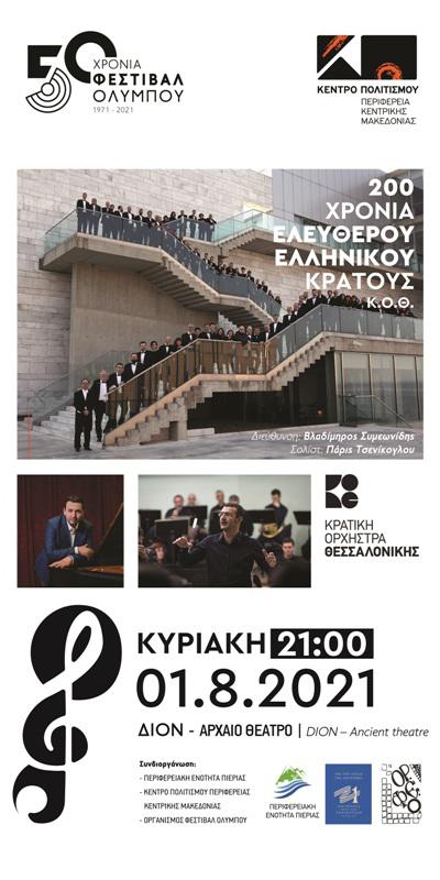 Το Κέντρο Πολιτισμού Περιφέρειας Κεντρικής Μακεδονίας σε συνδιοργάνωση με την Περιφερειακή Ενότητα Πιερίας και τον Οργανισμό Φεστιβάλ Ολύμπου σας προσκαλούν την Κυριακή 1 Αυγούστου 2021, στις 9 το βράδυ, στο αρχαίο θέατρο Δίου στη συναυλία αφιέρωμα στα «200 Χρόνια Ελεύθερου Ελληνικού Κράτους» με την Κρατική Ορχήστρα Θεσσαλονίκης.