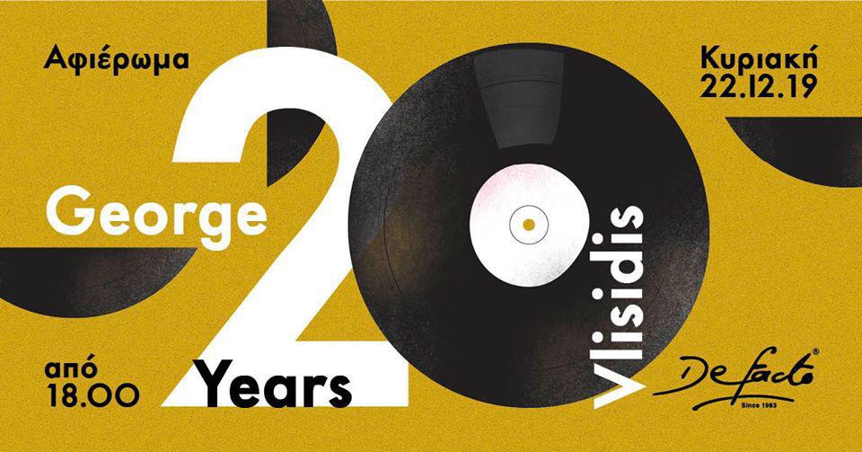 Ένα μεγάλο πάρτι για μια μεγάλη επέτειο: 20 χρόνια Γιώργος Βλυσίδης στο De Facto. 20 xρόνια αγάπες, φιλίες, φλερτ, συζητήσεις, ξενύχτια και ξημερώματα με τις μουσικές του στο φόντο. Η ανοιχτή γιορτή της Κυριακής 22 Δεκεμβρίου, θα τα έχει όλα: Κέφι, χαμόγελα, party spirit, μα προπάντων θα έχει Γιώργο Βλυσίδη στα decks να κερνάει τραγουδάρες.