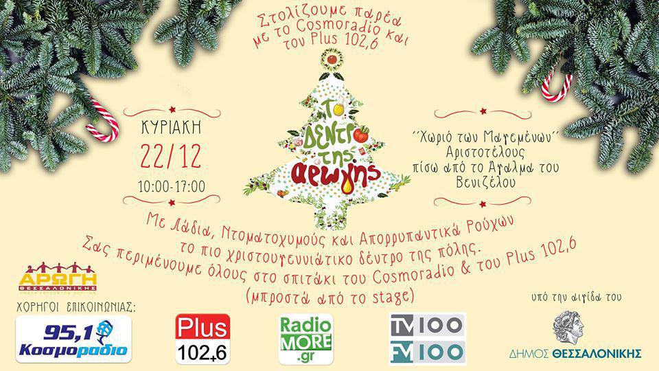 Την Κυριακή στολίζουμε το πιο Χριστουγεννιάτικο δέντρο της πόλης από τις 10:00 το πρωί έως τις 17:00 το απόγευμα. Φέρνουμε Λάδια, Ντοματοχυμούς και Απορρυπαντικά ρούχων, για να δημιουργήσουμε με πολύ κέφι, αγάπη και αλληλεγγύη ένα διαφορετικό δέντρο για τις άπορες οικογένειες που στηρίζει η Αρωγή Θεσσαλονίκης. Το Δέντρο της Αρωγής!