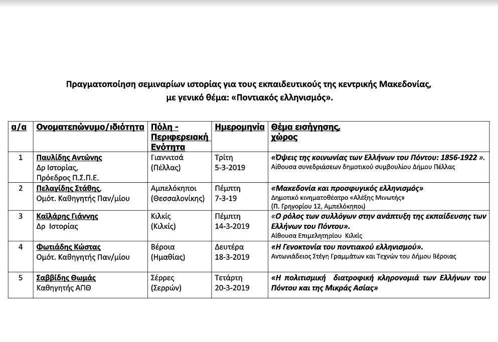 Η Περιφερειακή Ένωση Δήμων Κεντρικής Μακεδονίας (ΠΕΔ-ΚΜ) και ο Πανελλήνιος Σύνδεσμος Ποντίων Εκπαιδευτικών (Π.Σ.Π.Ε.), συνδιοργανώνουν σεμινάρια ιστορίας του Πόντου για τους εκπαιδευτικούς των σχολείων της Κεντρικής Μακεδονίας.