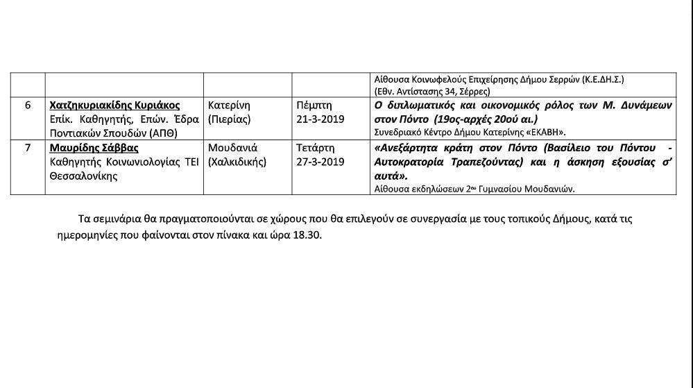 Το πρώτο σεμινάριο θα πραγματοποιηθεί αύριο, Τρίτη 5 Μαρτίου 2019, στην αίθουσα συνεδριάσεων του Δημοτικού Συμβουλίου Γιαννιτσών Πέλλας 18.30 μ.μ με θέμα «Όψεις της κοινωνίας των Ελλήνων του Πόντου: 1856-1922 ».