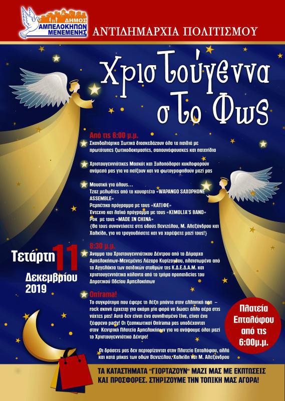 Χριστούγεννα στο Δήμο Αμπελοκήπων – Μενεμένης σημαίνει μια χριστουγεννιάτικη αγκαλιά, μια γιορτή που ενώνει κάθε πλατεία, κάθε γειτονιά. Την Τετάρτη 11 Δεκεμβρίου 2019 στις 19.00 στο άναμμα του Χριστουγεννιάτικου Δένδρου στην πλατεία Επταλόφου εκεί θα βρίσκεται ο Δήμαρχος Αμπελοκήπων – Μενεμένης Λάζαρος Κυρίζογλου μαζί με τους μοναδικούς«ΟΝΙRAMA». «Κλείσε τα μάτια» και «παραδώσου» στη μαγεία των γιορτών και αν και είναι «δύσκολος καιρός για πρίγκιπες» εμείς υποσχόμαστε να ανατρέψουμε κάθε αρνητική διάθεση γεμίζοντάς σας με θετική ψυχολογία και χαρά.