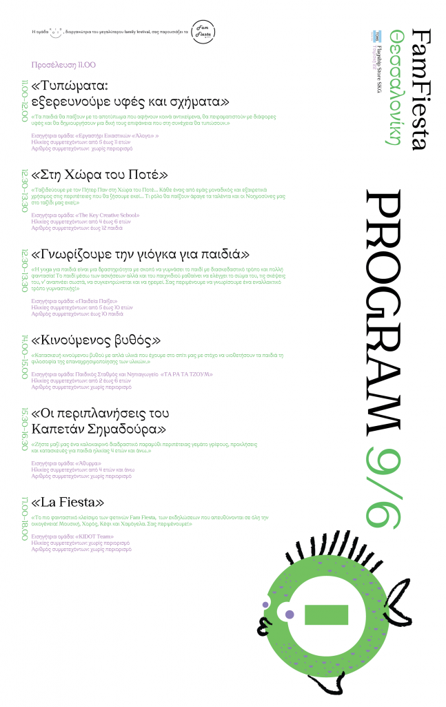 Οι επισκέπτες του Fam Fiesta καλούνται να βρίσκονται στο χώρο διεξαγωγής πριν την έναρξη των δράσεων και των εργαστηρίων έτσι ώστε να μπορέσουν να εξασφαλίσουν τη συμμετοχή τους σε αυτά!