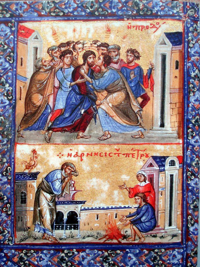 Επάνω: Η Προδοσία του Χριστού, απεικόνιση δάδων και πυρσών. Κάτω: Άρνηση του Πέτρου, απεικόνιση ανοιχτής φωτιάς, β΄ μισό 11ου αι., μικρογραφία του κώδ. 5, φ. 92r, Ευαγγέλιο, Πάρμα, Bibl. Palatina.