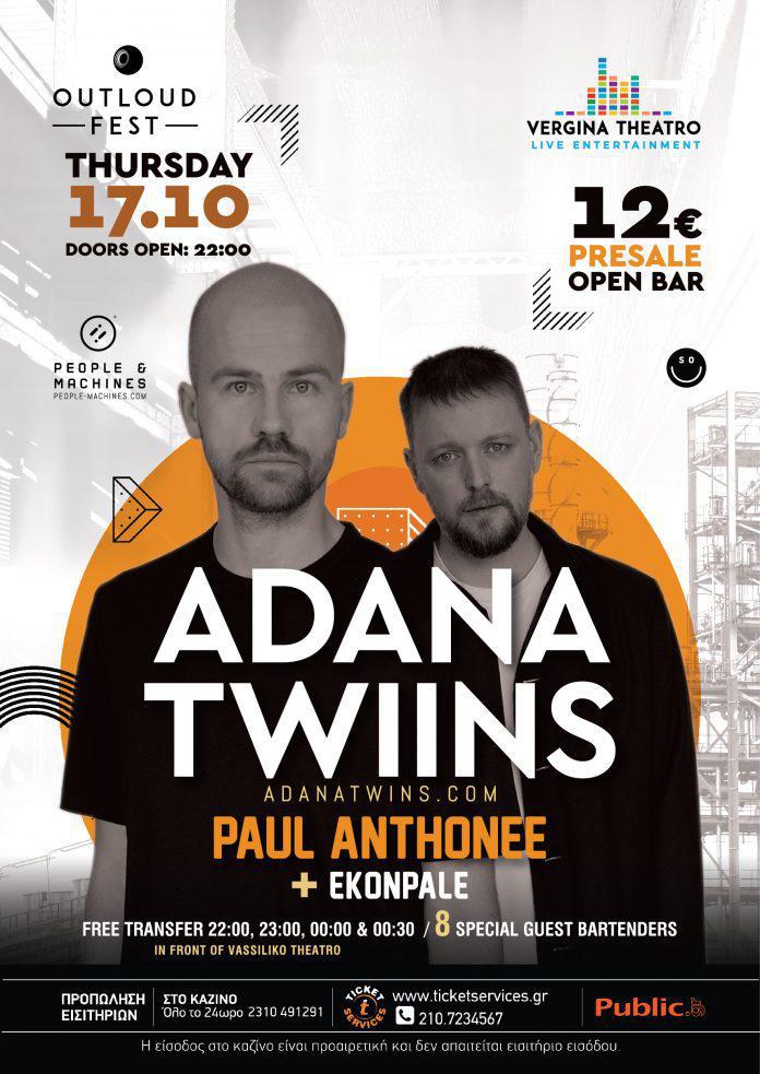 Οι Adana Twins αφήνουν για μια νύχτα το Αμβούργο και τα πιο εκρηκτικά live stages ηλεκτρονικής μουσικής στον κόσμο για να έρθουν Θεσσαλονίκη και να “υπογράψουν” με την παρουσία τους το πρώτο dance party της σεζόν στην πόλη, καλεσμένοι του Outloud Fest, την Πέμπτη 17 Οκτωβρίου 2019 στις 22:00 στο Vergina Theatro. Tην ατμόσφαιρα θα προθερμάνουν ο Paul Anthonee και ο Ekopnale. Σημείωσε πως με την είσοδο θα υπάρχει απεριόριστο ποτό το οποίο επιμελούνται 8 guest bartenders ενώ για τη διευκόλυνση της μετακίνησης, θα υπάρχει λεωφορείο από και προς το Βασιλικό Θέατρo. Διαβάστε αναλυτικά ΕΔΩ.