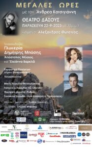 Η συναυλία «ΜΕΓΑΛΕΣ ΩΡΕΣ» του συνθέτη Ανδρέα Κατσιγιάννη μετά τη μεγάλη καλλιτεχνική επιτυχία και το sold out που σημείωσε στο Ηρώδειο, θα παρουσιαστεί στη Θεσσαλονίκη την Παρασκευή 22 Σεπτεμβρίου στις 20.30 στο Θέατρο Δάσους, με ερμηνευτές τη Γλυκερία, τον Δημήτρη Μπάση, τον Απόστολο Μόσιο και την Ελεάννα Βαρελά. Συμπράττει η Συμφωνική Ορχήστρα Δήμου Θεσσαλονίκης υπό τη διεύθυνση του μαέστρου Στάθη Σούλη. Αφηγητής ο ηθοποιός Σπύρος Μαβίδης σε κείμενα του Αλέξανδρου Φωτεινού.