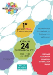Ελάτε να γνωρίσετε τις ομάδες και τους φορείς της πόλης που δραστηριοποιούνται στο ευρύ πεδίο STEAM* και μαζί με τα παιδιά σας επιλέξτε την εξωσχολική δραστηριότητα που ταιριάζει περισσότερο στα ενδιαφέροντα και την προσωπικότητά τους. Το NOESIS STEAM LAND 23 προσφέρει την ευκαιρία να συμμετέχετε στη μεγάλη αυτή εκδήλωση και να γνωρίσετε τον πυρήνα της STEAM εκπαίδευσης της πόλης, μέσα από παρουσιάσεις και workshops. Με περισσότερους από 30 εκθέτες (τοπικοί φορείς, εταιρίες, ΚΔΑΠ, εκπαιδευτήρια κ.ά.) το NOESIS STEAM LAND 23 προσφέρει την ευκαιρία να συμμετέχετε στη μεγάλη αυτή εκδήλωση και να γνωρίσετε τον πυρήνα της STEAM εκπαίδευσης της πόλης, μέσα από παρουσιάσεις και workshops.