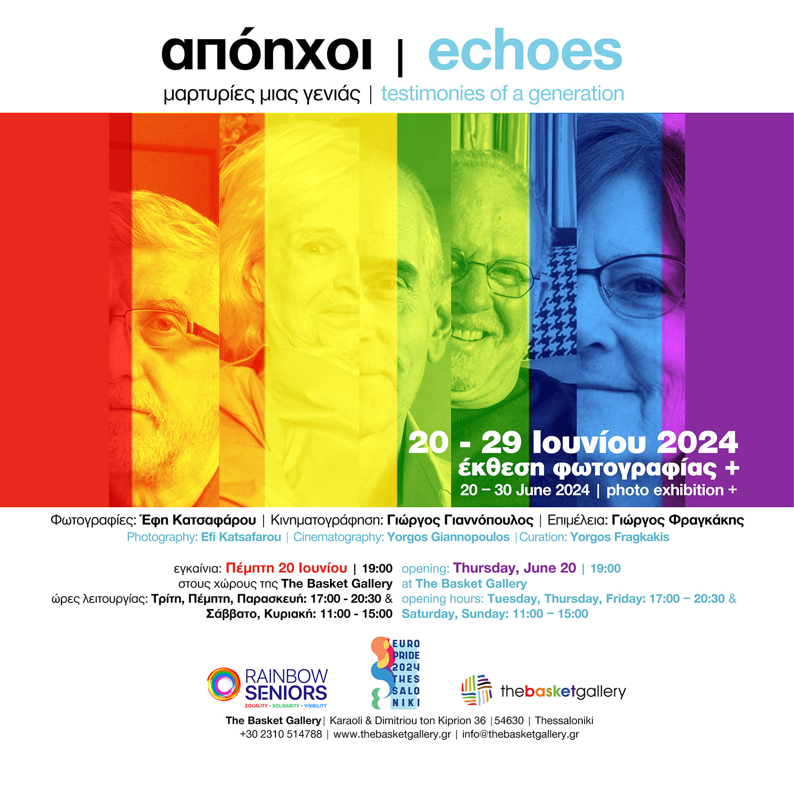 Η The Basket Gallery συμμετέχει στο EuroPride2024 Thessaloniki φιλοξενώντας την έκθεση «Απόηχοι. Μαρτυρίες μιας γενιάς». Τα εγκαίνια της έκθεσης θα πραγματοποιηθούν την Πέμπτη 20 Ιουνίου, ώρα 19:00. Κατά τη διάρκεια της έκθεσης τα ωράρια επίσκεψης διαμορφώνονται ως εξής: Τρίτη, Πέμπτη, Παρασκευή: 17:00 – 20:30 και Σάββατο, Κυριακή: 11:00 – 15:00