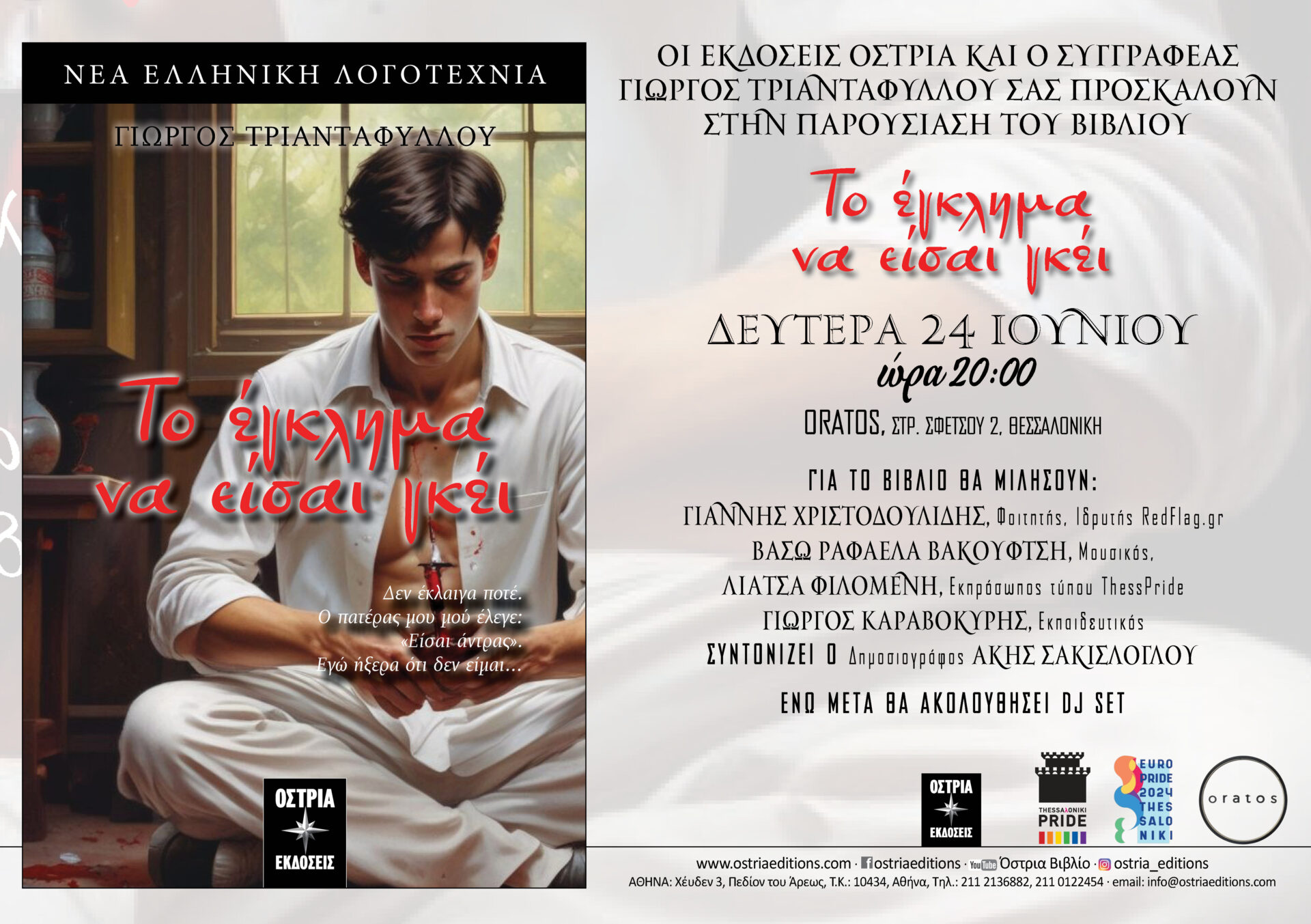 Στις 24 του Ιουνίου και συγκεκριμένα στις 20:00 το βράδυ στον Ορατό, θα λάβει χώρα η παρουσίαση του βιβλίου του Γιώργου Τριανταφύλλου με τίτλο «Το έγκλημα να είσαι γκέι». Η παρουσίαση θα πραγματοποιηθεί στα πλαίσια του Europride 2024, και για το βιβλίο θα μιλήσουν ο εκπαιδευτικός Γιώργος Καραβοκύρης, ο φοιτητής – ιδρυτής του redflag.gr Γιάννης Χριστοδουλίδης, η μουσικός Βάσω- Ραφαέλα Βακουφτσή και η εκπρόσωπος τύπου του ThessPride Φιλομένη Λιάτσα. Μετά την συζήτηση θα ακολουθήσει DJ set. Το έργο αυτό , είναι ένα κοινωνικό μυθιστόρημα το οποίο και εκδίδεται από τις εκδόσεις Όστρια, και αφορά ένα ευρύ φάσμα κοινωνικών ζητημάτων , όπως η αναπηρία , η σεξουαλικότητα και η μετανάστευση. Παρακάτω αναγράφεται και η υπόθεση :