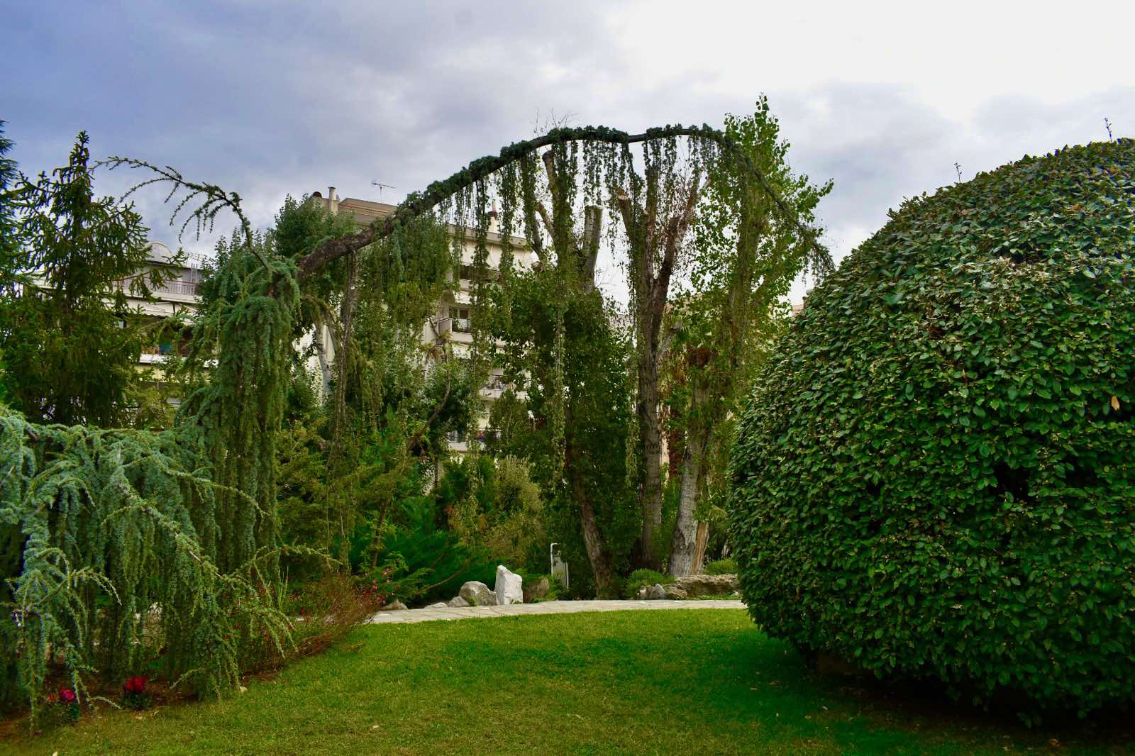 Στο κέντρο δεσπόζει το ρομαντικό κιόσκι με ποικιλίες αναρριχώμενων φυτών και το θερμοκήπιο που φιλοξενεί τροπικά, υποτροπικά, επίφυτα, υδροχαρή και σαρκοφάγα φυτά.