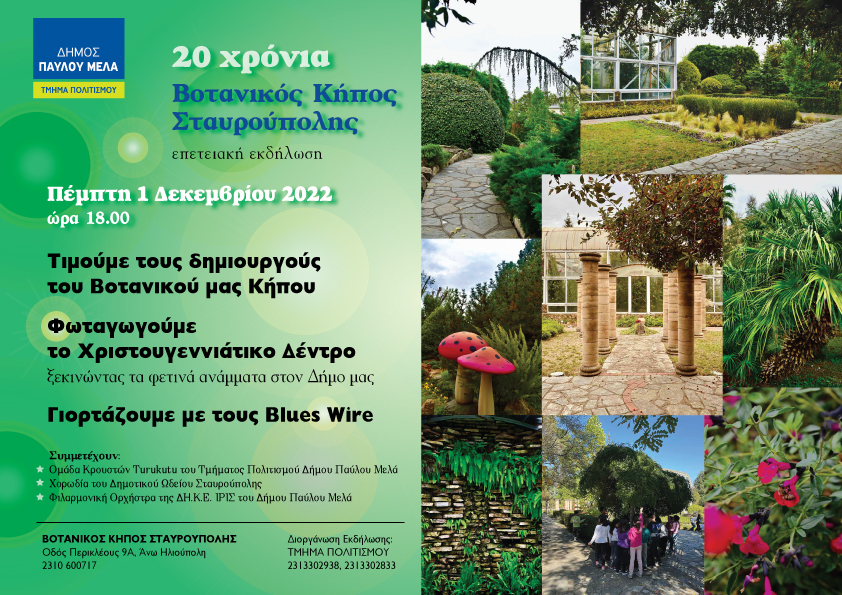 Ο Δήμαρχος Παύλου Μελά Δημήτρης Δεμουρτζίδης και ο Αντιδήμαρχος Πολιτισμού – Αθλητισμού Παντελής Νιγδέλης σας προσκαλούν στην επετειακή εκδήλωση για τα 20 χρόνια του Βοτανικού Κήπου Σταυρούπολης που θα πραγματοποιηθεί την Πέμπτη 1 Δεκεμβρίου 2022 και ώρα 18.30.