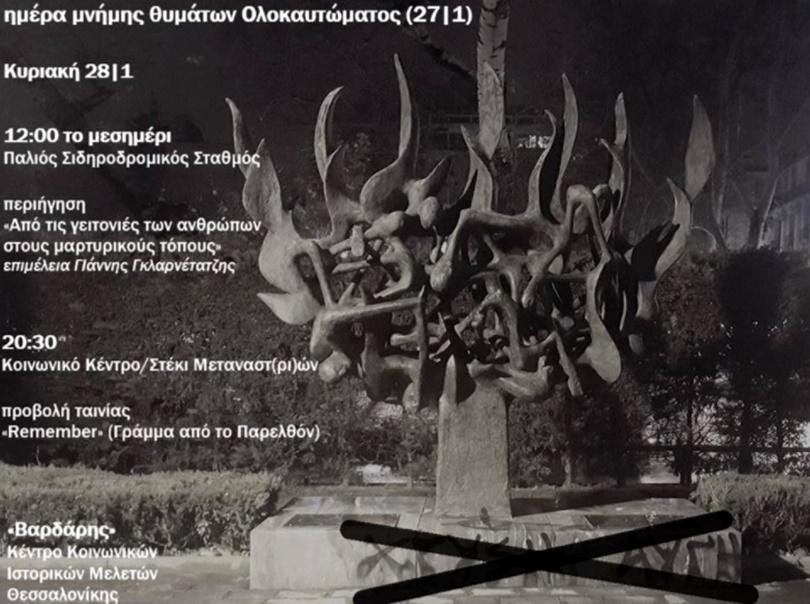 Το Κέντρο Κοινωνικών Ιστορικών Μελετών Θεσσαλονίκης «Βαρδάρης» διοργανώνει μια σειρά από δράσεις την Κυριακή 28 Ιανουαρίου. Στις 12.00 προγραμματίζεται περιήγηση με θέμα «Από τις γειτονιές των ανθρώπων στους μαρτυρικούς τόπους» και οδηγό τον Γιάννη Γκλαρνέτατζη, με αφετηρία τον Παλιό Σιδηροδρομικό Σταθμό, από όπου έφευγαν τα τρένα του θανάτου για το Άουσβιτς. Το βράδυ της ίδιας μέρα, στις 20.30, θα προβληθεί η ταινία ”Remember” (Γράμμα από το Παρελθόν) στο Κοινωνικό Κέντρο / Στέκι Μεταναστών (Ερμού 23).