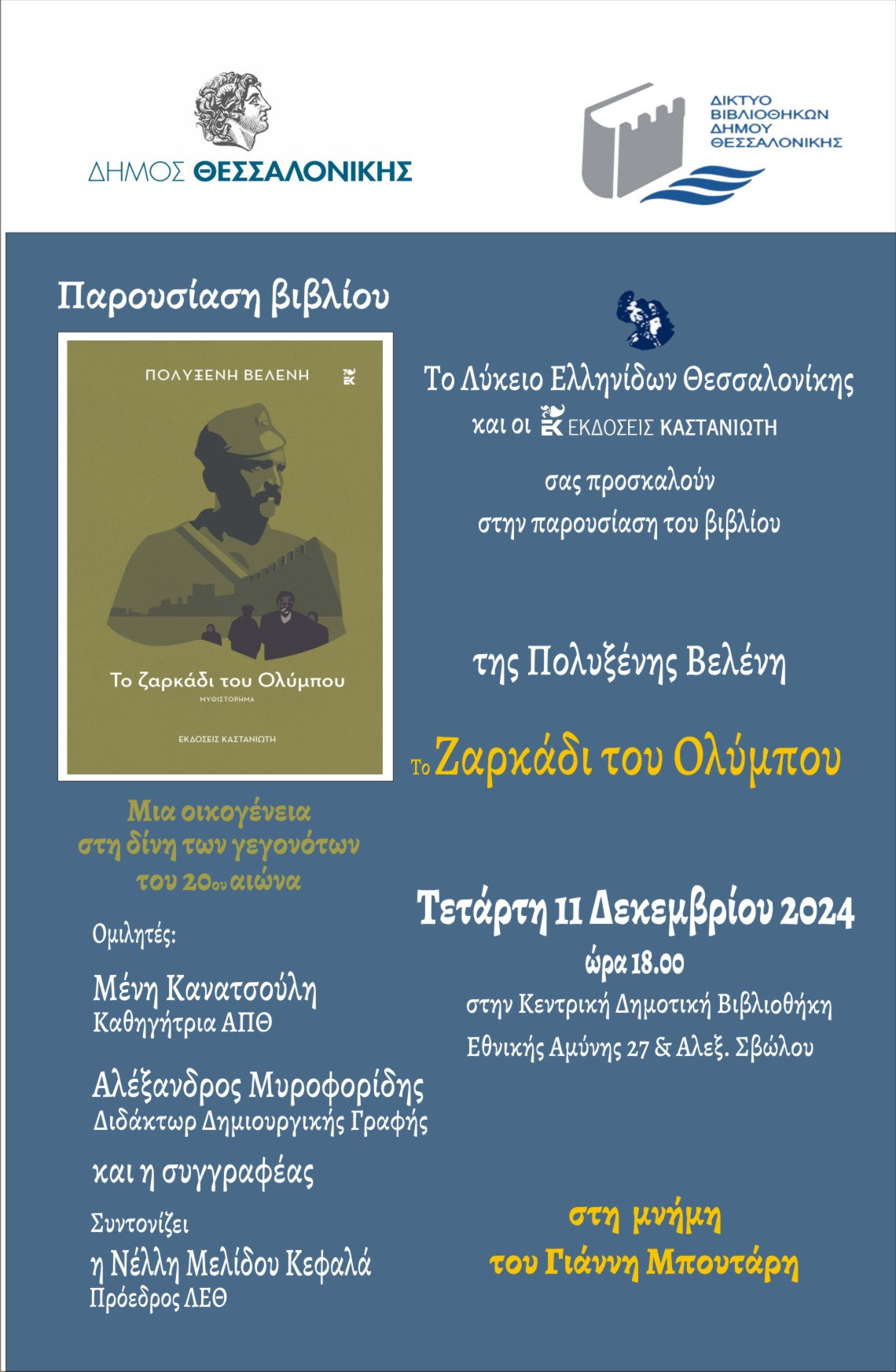 Η Κεντρική Βιβλιοθήκη του Δήμου Θεσσαλονίκης, το Λύκειο Ελληνίδων Θεσσαλονίκης & οι Εκδόσεις Καστανιώτη σας προσκαλούν στην εκδήλωση παρουσίασης του βιβλίου της Πολυξένης Βελένη «Το Ζαρκάδι του Ολύμπου» την Τετάρτη 11 Δεκεμβρίου 2024, ώρα 18.00 στην Αίθουσα Εκδηλώσεων της Κεντρικής Βιβλιοθήκης.