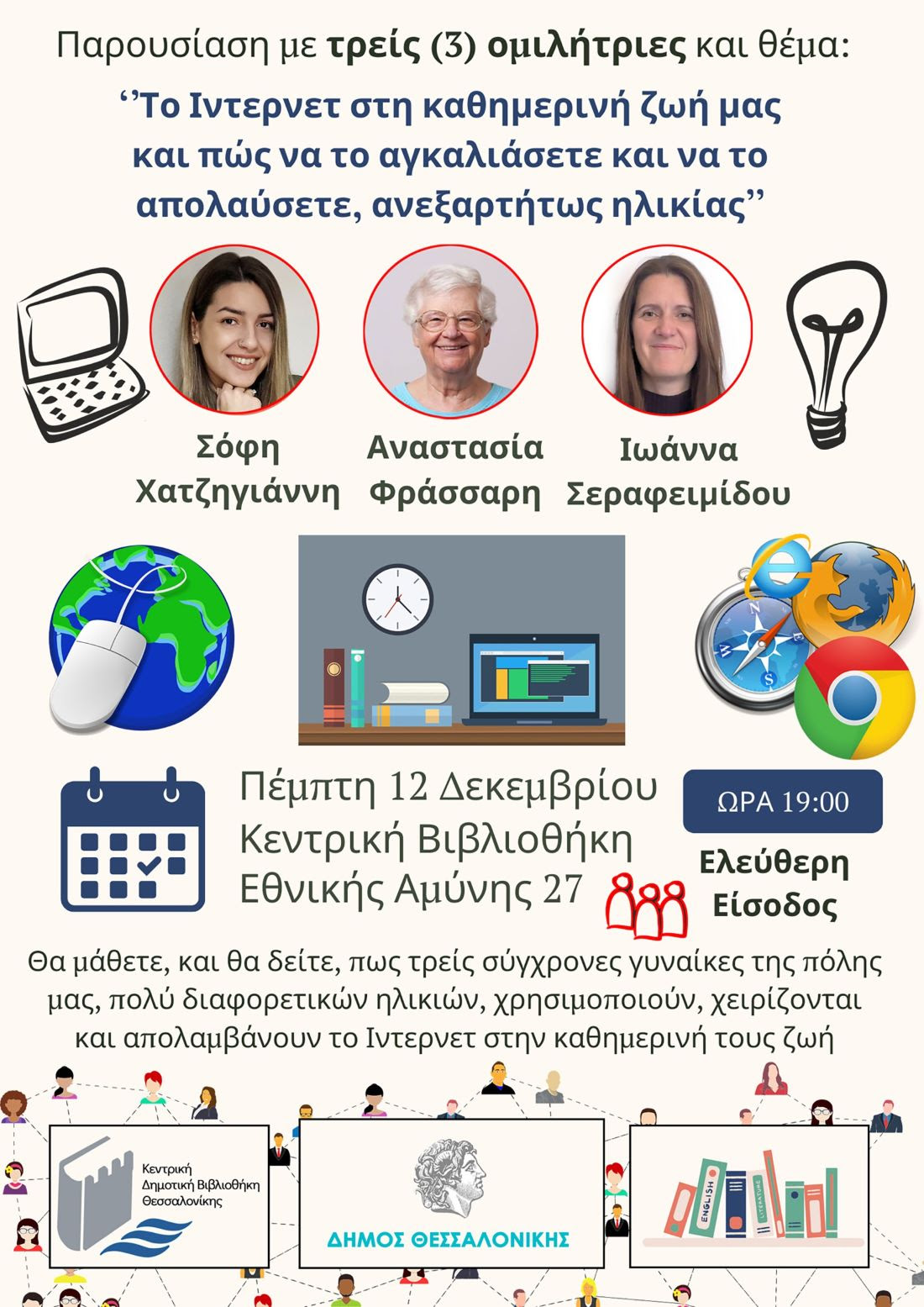 Η Κεντρική Βιβλιοθήκη του Δήμου Θεσσαλονίκης σας προσκαλεί στην παρουσίαση-ομιλία με θέμα «Το Internet στην καθημερινή ζωή μας, και πώς να το αγκαλιάσετε και να το απολαύσετε ανεξαρτήτως ηλικίας» με όχι μία, αλλά τρείς εισηγήτριες: τις κ. κ. Αναστασία Φράσσαρη, Ιωάννα Σεραφειμίδου και Σόφη Χατζηγιάννη, που θα γίνει στην Αίθουσα Εκδηλώσεων της Κεντρικής Βιβλιοθήκης (Εθν. Αμύνης 27 & Αλ. Σβώλου,2ος όρ.), την Πέμπτη 12 Δεκεμβρίου 2024, στις 7 μ.μ.