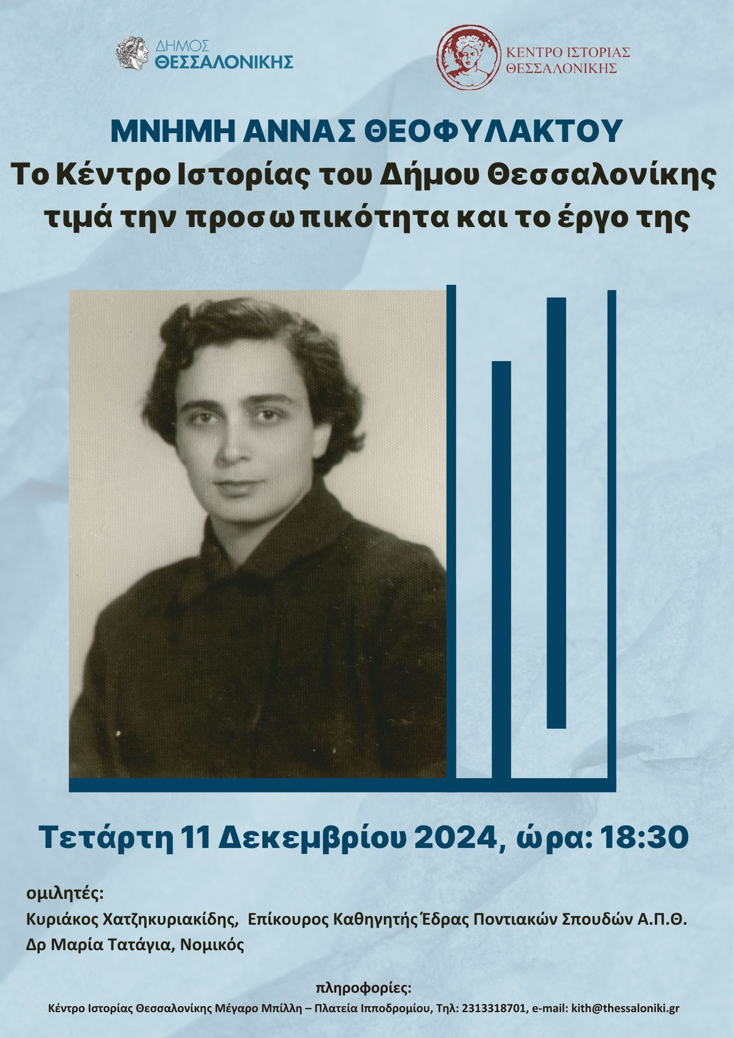 Το Κέντρο Ιστορίας Θεσσαλονίκης (Κ.Ι.Θ.) του Δήμου Θεσσαλονίκης διοργανώνει εκδήλωση στη μνήμη της Άννας Θεοφυλάκτου, τιμώντας την προσωπικότητα και το έργο της.