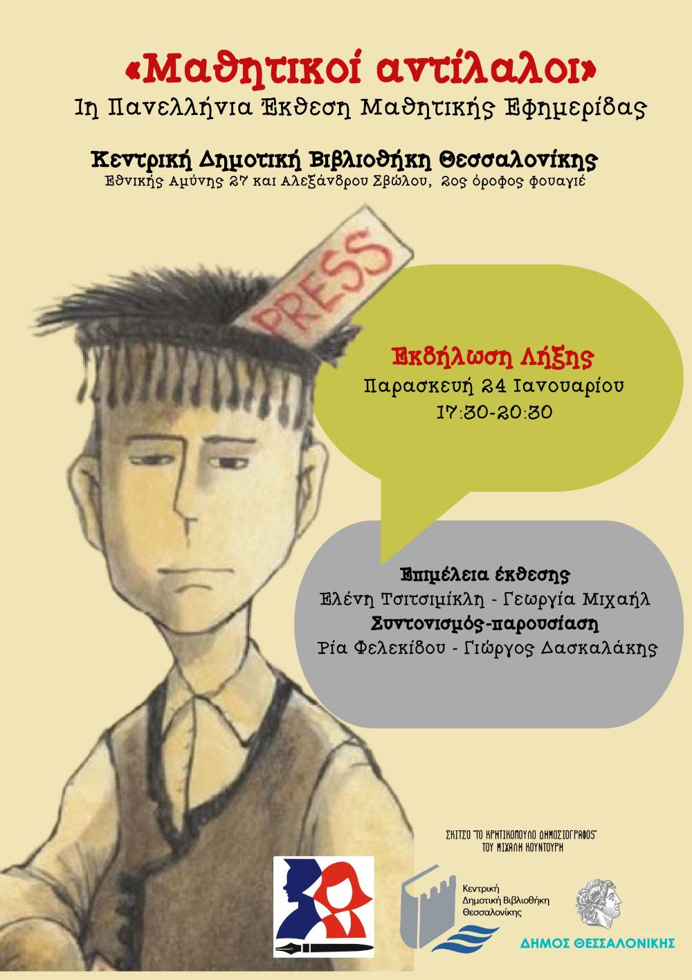 Συνεχίζει τη λειτουργία της η 1η Πανελλήνια Έκθεση Μαθητικής Εφημερίδας με τον τίτλο «Μαθητικοί αντίλαλοι» που οργανώνει η Κεντρική Βιβλιοθήκη του Δήμου Θεσσαλονίκης σε συνεργασία με τον Όμιλο Φίλων Νεανικού Τύπου (www.hellenicyouthpress.gr).