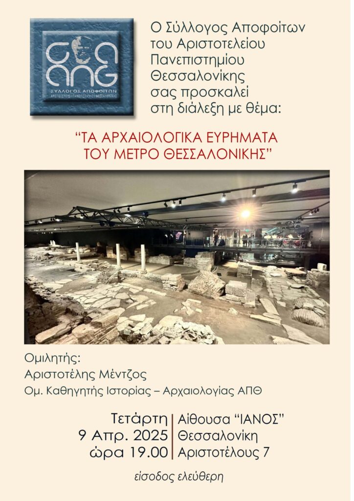 Την Τρίτη 8 Απριλίου, στις 19:00 η Αλυσίδα Πολιτισμού IANOS και ο Σύλλογος Αποφοίτων Α.Π.Θ διοργανώνουν Ομιλία του Ομότιμου Καθηγητή Ιστορίας- Αρχαιολογίας ΑΠΘ Αριστοτέλη Μέντζιου με θέμα: «Τα αρχαιολογικά ευρήματα του METRO Θεσσαλονίκης»