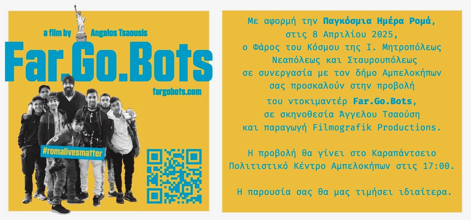 Με αφορμή την Παγκόσμια Ημέρα Ρομά, στις 8 Απριλίου 2025, ο Φάρος του Κόσμου της Ι. Μητροπόλεως Νεαπόλεως και Σταυρουπόλεως σε συνεργασία με τον δήμο Αμπελοκήπων σας προσκαλούν στην προβολή του ντοκιμαντέρ Far. Go. Bots., σε σκηνοθεσία Άγγελου Τσαούση και παραγωγή Filmografik Productions.