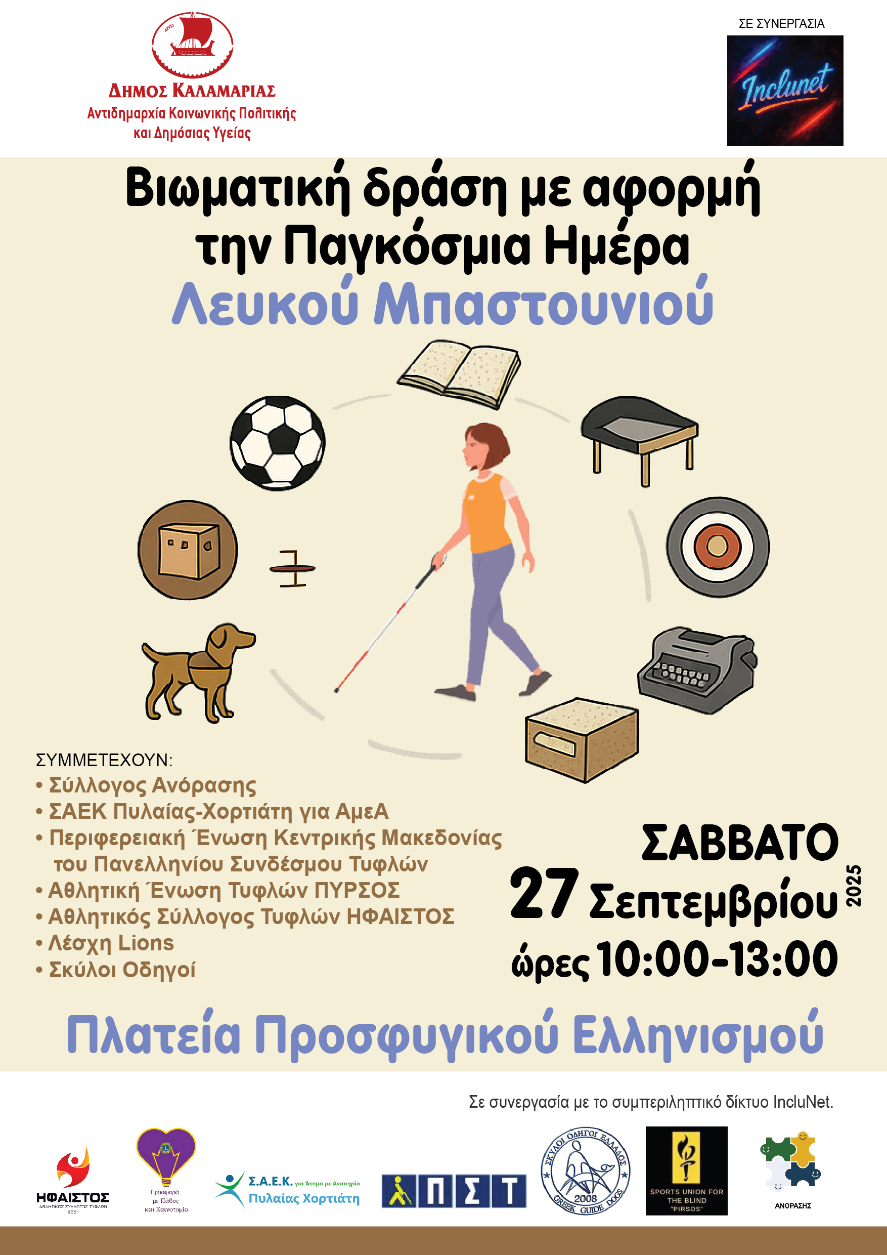 Ο Δήμος Καλαμαριάς σε συνεργασία με το συμπεριληπτικό δίκτυο IncluNet, διοργανώνει το Σάββατο 27 Σεπτεμβρίου 2025, από τις 10:00 έως τις 13:00, στην Πλατεία Προσφυγικού Ελληνισμού, μία ξεχωριστή βιωματική δράση με αφορμή την Παγκόσμια Ημέρα Λευκού Μπαστουνιού.