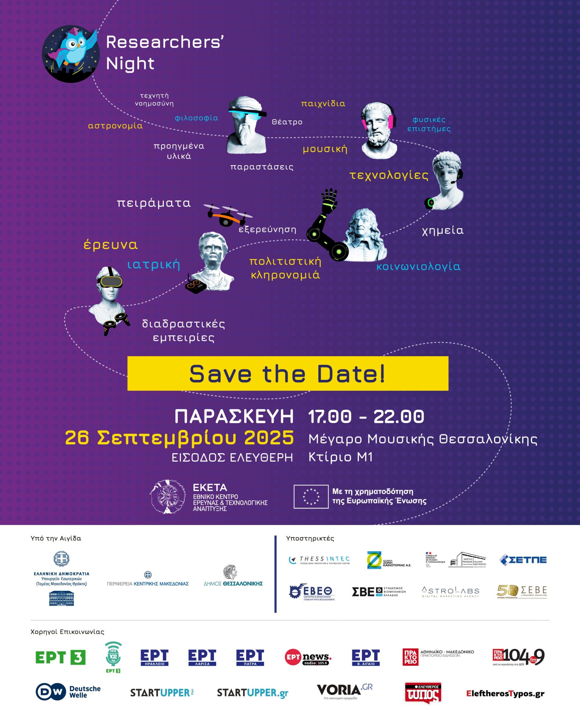 Συνεχίζοντας την παράδοση για μία ακόμη χρονιά, το ΕΚΕΤΑ διοργανώνει και συντονίζει τη «Βραδιά του Ερευνητή» στη Θεσσαλονίκη, η οποία θα πραγματοποιηθεί την Παρασκευή 26 Σεπτεμβρίου 2025, στο Μέγαρο Μουσικής (κτίριο Μ1). Η φετινή εκδήλωση αποκτά ξεχωριστή σημασία, καθώς το ΕΚΕΤΑ γιορτάζει φέτος τα 25 χρόνια από την ίδρυσή του.
