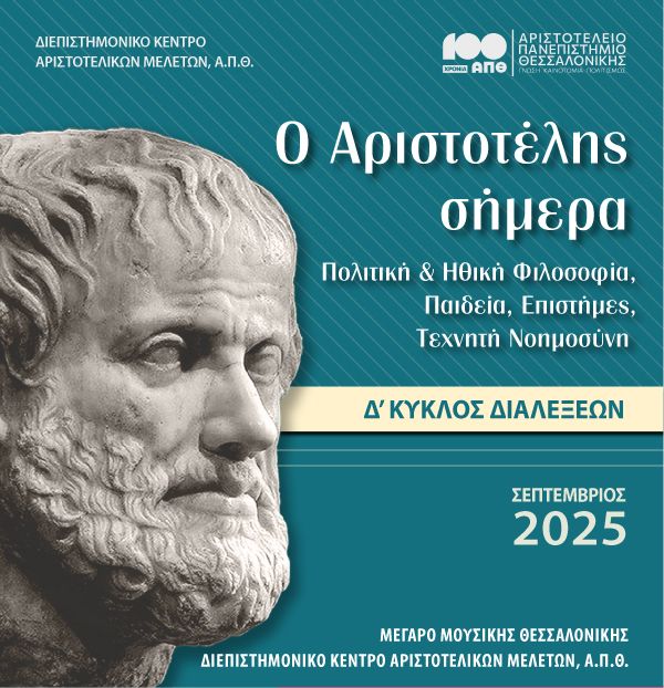 Στο πλαίσιο του εορτασμού των 100 χρόνων από την ίδρυση του Αριστοτελείου Πανεπιστημίου Θεσσαλονίκης, το Διεπιστημονικό Κέντρο Αριστοτελικών Σπουδών του ΑΠΘ διοργανώνει τον Δ΄ Κύκλο Διαλέξεων με γενικό τίτλο: «Ο Αριστοτέλης Σήμερα» και θεματική: «Πολιτική και Ηθική Φιλοσοφία, Παιδεία, Επιστήμες, Τεχνητή Νοημοσύνη».