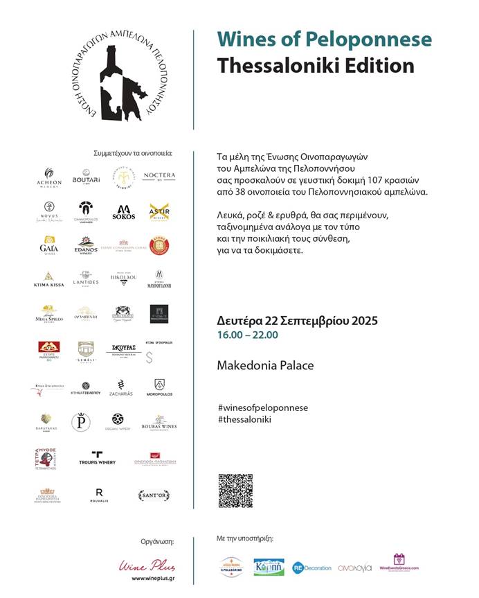Τα μέλη της Ένωσης Οινοπαραγωγών του Αμπελώνα της Πελοποννήσου σας προσκαλούν σε γευστική δοκιμή 107 κρασιών από 38 οινοποιεία του Πελοποννησιακού αμπελώνα.