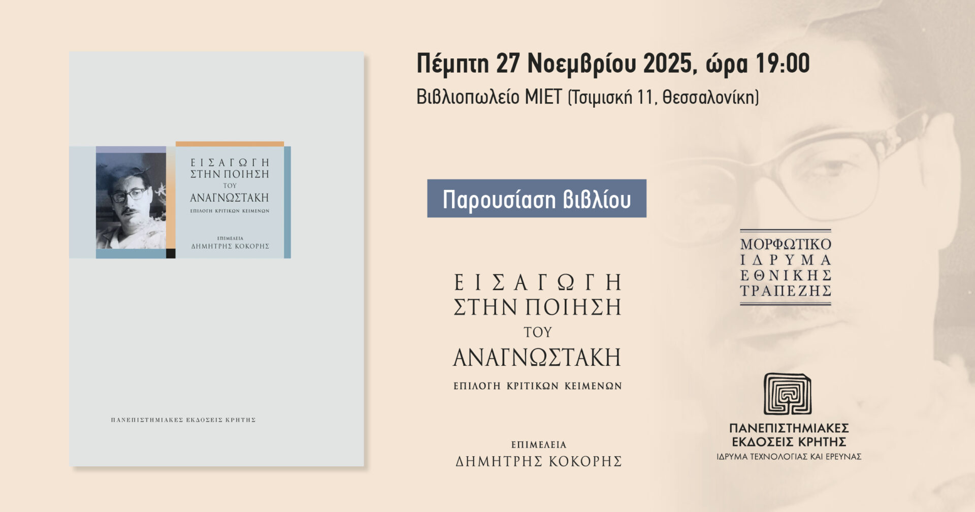Οι Πανεπιστημιακές Εκδόσεις Κρήτης και το Μορφωτικό Ίδρυμα Εθνικής Τραπέζης σας προσκαλούν στην παρουσίαση του βιβλίου: ”Εισαγωγή στην ποίηση του Αναγνωστάκη (εκδ. ΠΕΚ)”, Επιμέλεια Δ. Κόκορης, η οποία θα πραγματοποιηθεί την Πέμπτη 27 Νοεμβρίου 2025,