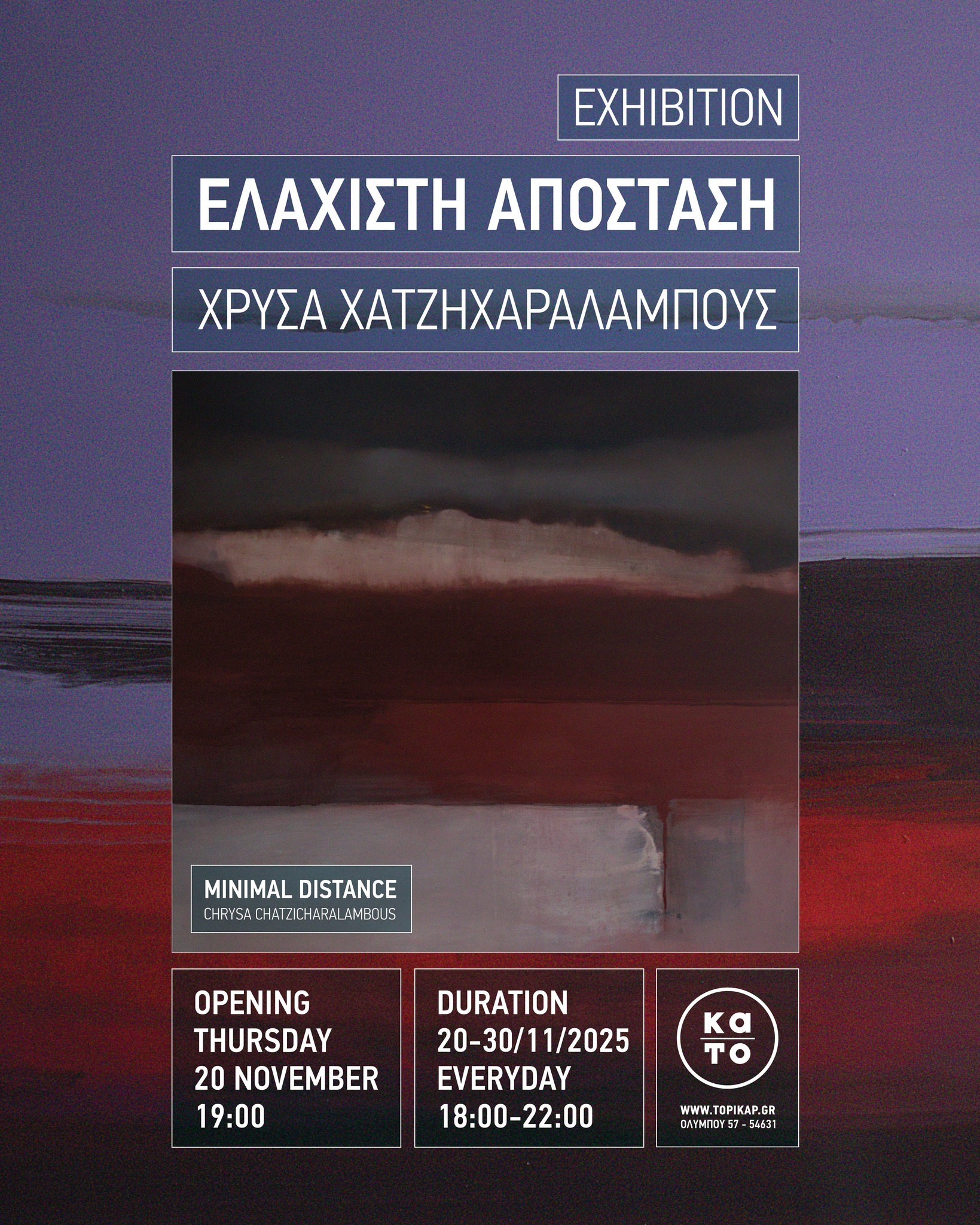 Το To Pikap Kato φιλοξενεί την ατομική έκθεση ζωγραφικής της Χρύσας Χατζηχαραλάμπους με τίτλο «Ελάχιστη Απόσταση», από την Πέμπτη 20 Νοεμβρίου έως και το Σάββατο 30 Νοεμβρίου 2025.