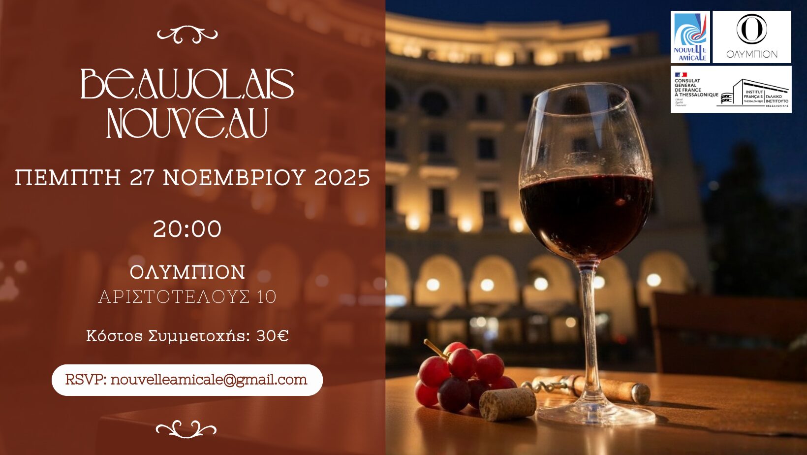 Ο Σύλλογος Παλαιών Μαθητών και Φίλων του Γαλλικού Ινστιτούτου Θεσσαλονίκης «NOUVELLE AMICALE» καλεί τους φίλους του κρασιού να γιορτάσουν μαζί την έλευση του φετινού Beaujolais Nouveau.