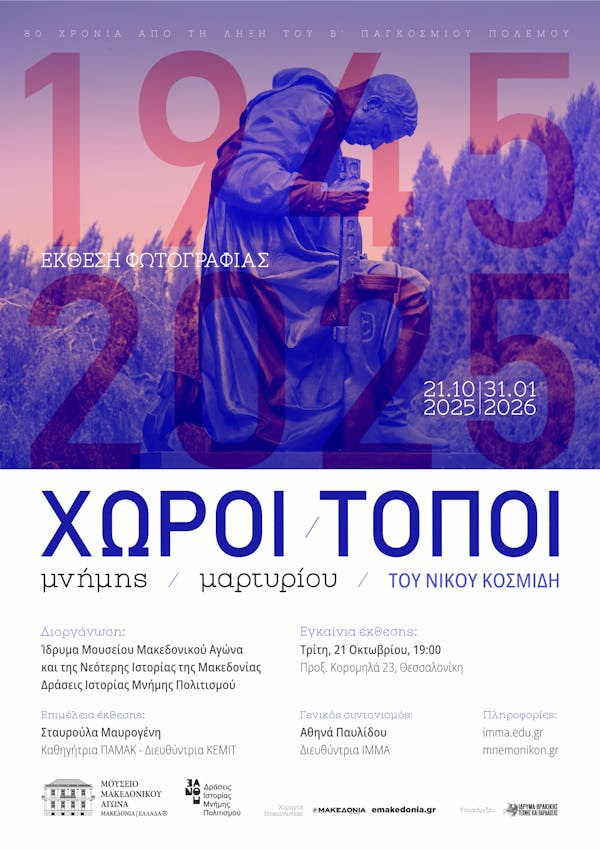 Το Ίδρυμα Μουσείου Μακεδονικού Αγώνα και της Νεότερης Ιστορίας της Μακεδονίας σας προσκαλεί στα εγκαίνια της έκθεσης φωτογραφίας «Χώροι Μνήμης, Τόποι Μαρτυρίου» του Νίκου Κοσμίδη, την Τρίτη 21 Οκτωβρίου 2025 στις 19:00, στην Αίθουσα «Αλέξανδρος Χαΐτογλου» του Μουσείου Μακεδονικού Αγώνα. Την έκθεση θα εγκαινιάσει ο Αντιπεριφερειάρχης ΜΕ Θεσσαλονίκης, κ. Κωνσταντίνος Ν. Γιουτίκας.