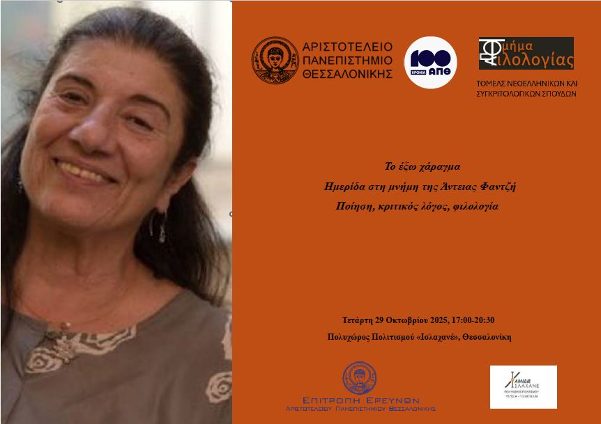 Ο Τομέας Νεοελληνικών και Συγκριτολογικών Σπουδών του Τμήματος Φιλολογίας ΑΠΘ διοργανώνει Ημερίδα με τίτλο «Το έξω χάραγμα. Ημερίδα στη μνήμη της Άντειας Φραντζή. Ποίηση, κριτικός λόγος, φιλολογία», στις 29 Οκτωβρίου 2025, ώρες 17:00 με 21:00, στον πολυχώρο πολιτισμού Ισλαχανέ, τιμώντας ένα ξεχωριστό μέλος της ακαδημαϊκής του οικογένειας.