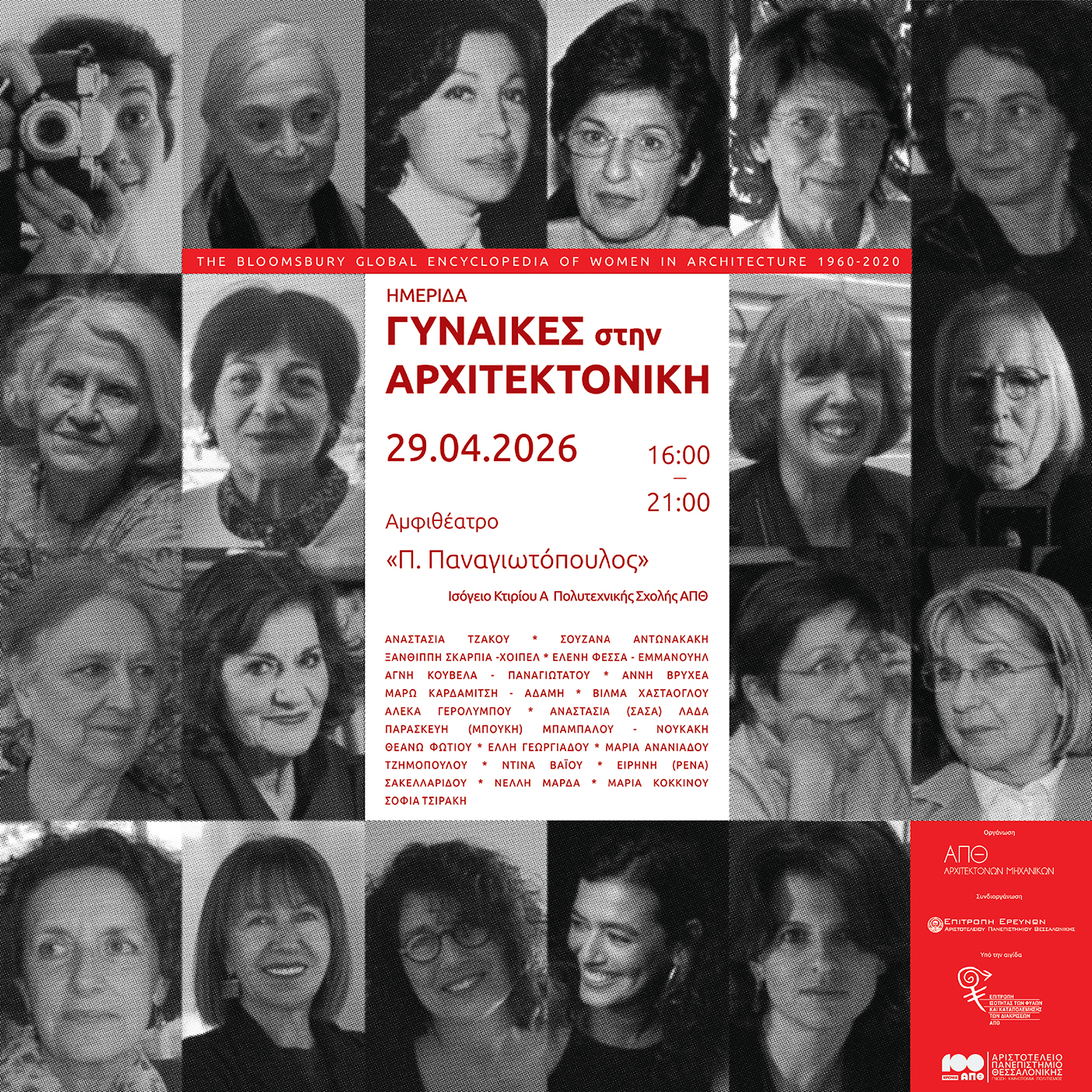 - Παρουσίαση του έργου των δεκαεννέα αρχιτεκτονισσών που περιλαμβάνονται στην ελληνική ενότητα και δραστηριοποιήθηκαν στον ελληνικό χώρο κατά το διάστημα 1960–2020. Περιλαμβάνονται έξι είναι απόφοιτες και ομότιμες καθηγήτριες του Τμήματος Αρχιτεκτόνων Μηχανικών του ΑΠΘ.