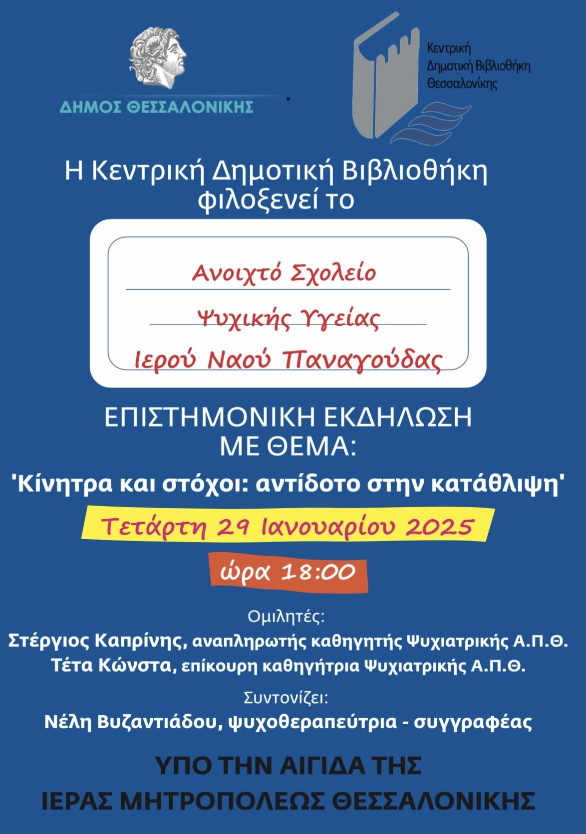 Το Ανοιχτό Σχολείο Ψυχικής Υγείας του Ιερού Ναού Παναγούδας, υπό την Αιγίδα της Ιεράς Μητροπόλεως Θεσσαλονίκης, επιστρέφει την Τετάρτη 29 Ιανουαρίου 2025, στις 6 μ.μ., στην Κεντρική Δημοτική Βιβλιοθήκη, με την επιστημονική εκδήλωση: «Κίνητρα και στόχοι: αντίδοτο στην κατάθλιψη».