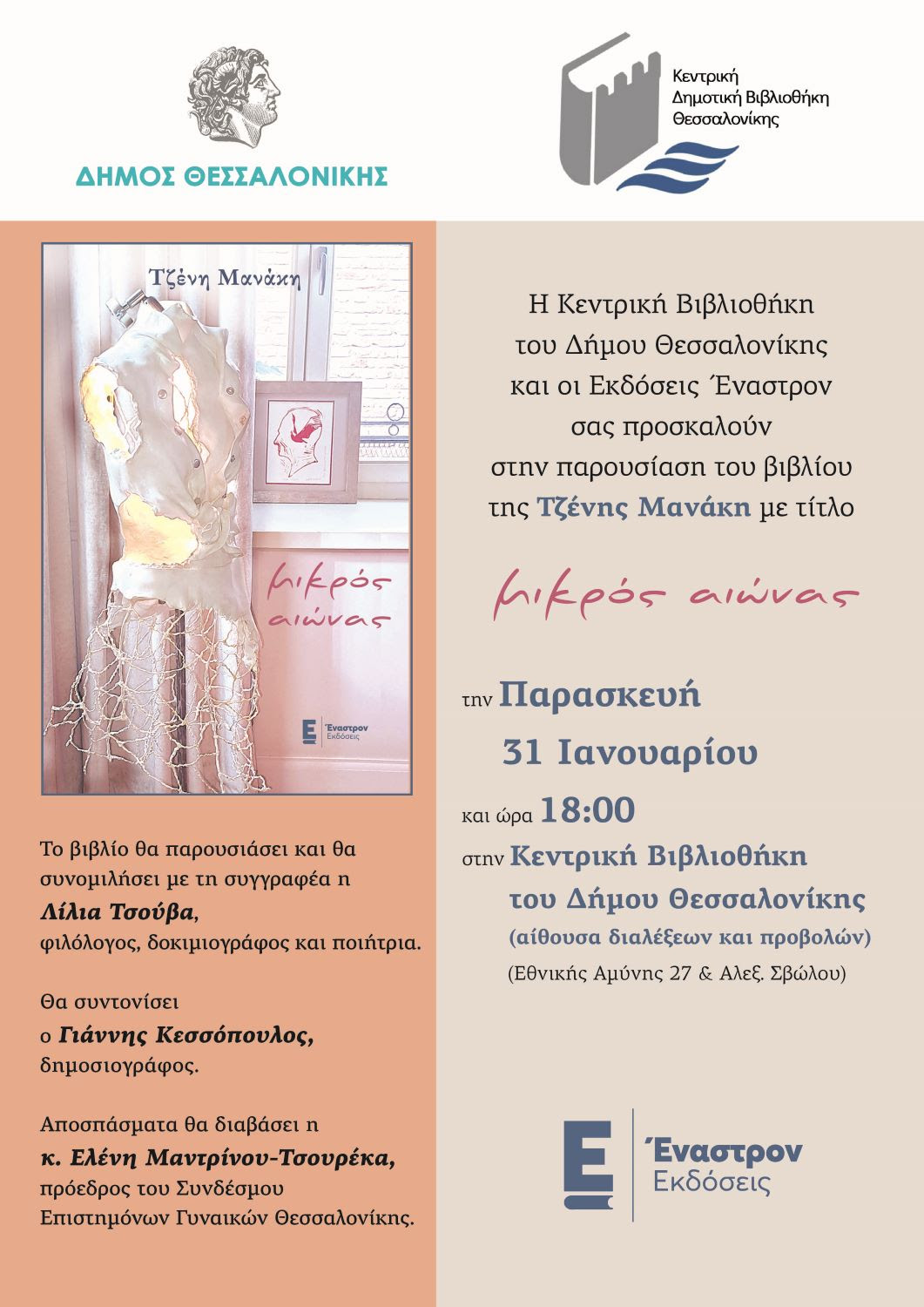 Η Κεντρική Δημοτική βιβλιοθήκη Θεσσαλονίκης και οι Εκδόσεις Έναστρον σας προσκαλούν στην παρουσίαση του βιβλίου της Τζένης Μανάκη με τίτλο «Μικρός αιώνας», την Παρασκευή, 31 Ιανουαρίου 2025 και ώρα 6 μ.μ. στην Κεντρική Δημοτική Βιβλιοθήκη (Εθνικής Αμύνης 27 και Αλ. Σβώλου).