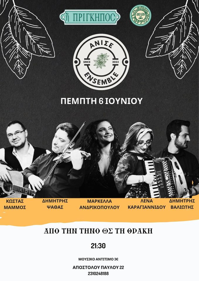 Πέμπτη 6 Ιουνίου 2024 στις 21:30 Οι Ανισέ στην Πρίγκηπο (Αποστόλου Παύλου 22) Είσοδος 3 ευρώ | Κρατήσεις 2310248188
