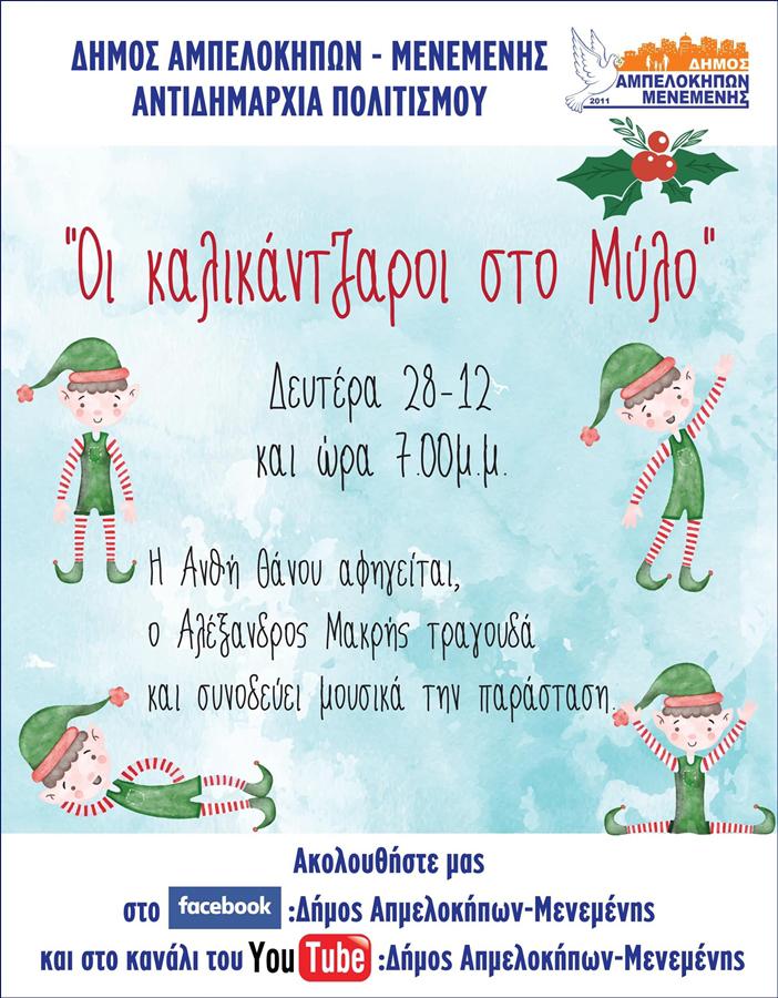 Λίγο πριν την Πρωτοχρονιά η Ανθή Θάνου και ο Αλέξανδρος Μακρής μας καλωσορίζουν στην μουσική παράστασή τους “Οι Καλικάντζαροι στο μύλο”.