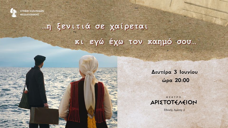 «..Η ξενιτιά σε χαίρεται κι εγώ έχω τον καημό σου…» Θέατρο Αριστοτέλειον | Δευτέρα 3 Ιουνίου 2024, ώρα 8.00 μ.μ. Η μυθοπλασία που αναφέρεται στην ελληνική διασπορά, ξεκινάει με ένα γάμο σε κάποιο χωριό της Φλώρινας γύρω στα 1935 και… φτάνει ως την Αστόρια της Νέας Υόρκης τη δεκαετία του 1960. Παρουσιάζονται χοροί και τραγούδια από διάφορα μέρη της Ελλάδας και ιδιαίτερα από αυτά που έχουν πολλούς ξενιτεμένους. Πληροφορίες: Λύκειο Ελληνίδων Θεσσαλονίκης 2310277431 2310277437