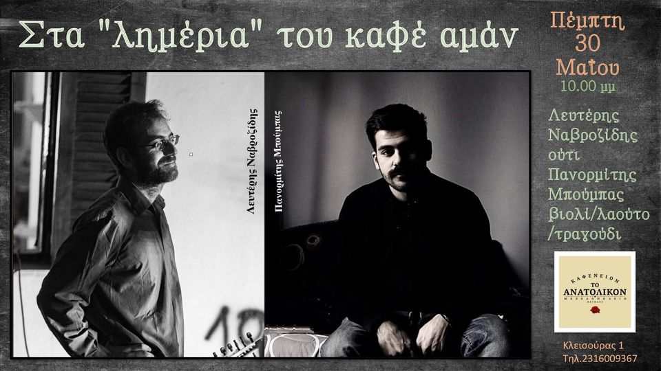 Ο Λευτέρης Ναβροζίδης (ούτι) και ο Πανορμίτης Μπούμπας (βιολί, τραγούδι) θα συμπράξουν βασισμένοι στο ρεπερτόριο του καφέ αμάν! Μουσικό αντίτιμο 4 ευρώ