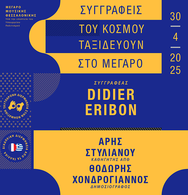 Το Μέγαρο Μουσικής Θεσσαλονίκης υποδέχεται τον Γάλλο συγγραφέα, κοινωνιολόγο και φιλόσοφο Didier Eribon, στο πλαίσιο του κύκλου παρουσιάσεων «Συγγραφείς του Κόσμου».