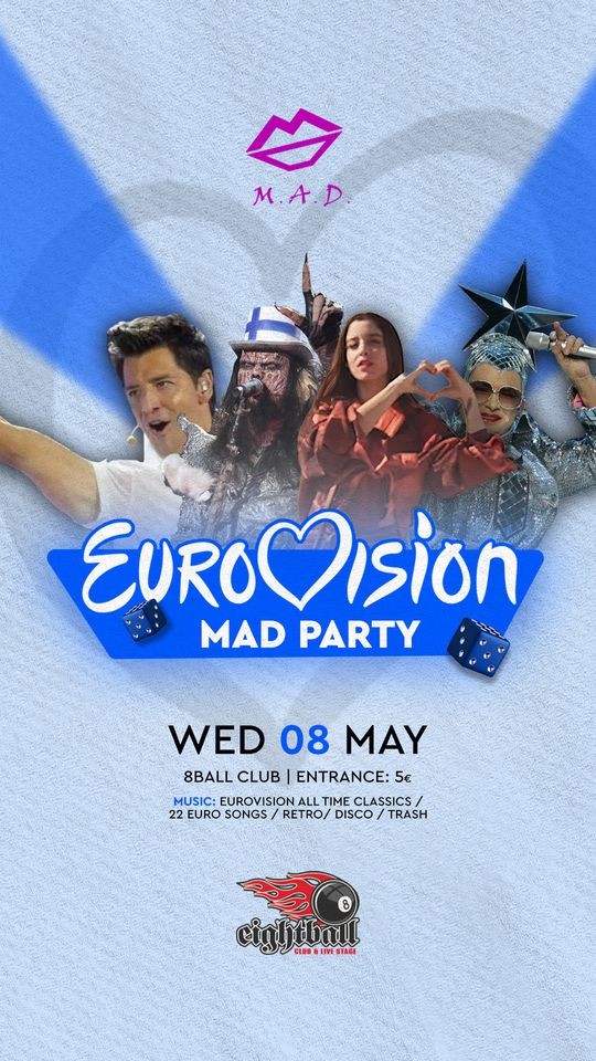 12 POINTS GO TOOOO …… 8BALL!!! Η Mad Dreams Επιστρέφει στον χώρο του 8BALL μετά πό καιρό με ένα event Κόλασηηη!!! Την Τετάρτη 8/5 παρτάρουμε σε ρυθμούς Eurovision και θυμόμαστε τα αγαπημένα μας κομμάτια του θεσμού [παλιά και καινούργια] σε ένα θεματικό παρτυ φτιαγμένο να σε ξεσηκώσει!!! Σάκης – Ρουσλάνα – Ζιμπεν ζιμπεν – Τερατα – Αλεξαντερ Ριμπακ – και πολλά άλλα Eurovision Classic Hits !! Επιτρέπονται στολές και σημαίες . Special Games with Points and Drinks. Music : All time Eurovision Tracks + [ Disco – Retro ] | Djs:Vagelas-Maestros | Time : WED 8/5 at 23:00 | Place : 8ball Club Thessaloniki | Entrance: 5Ε