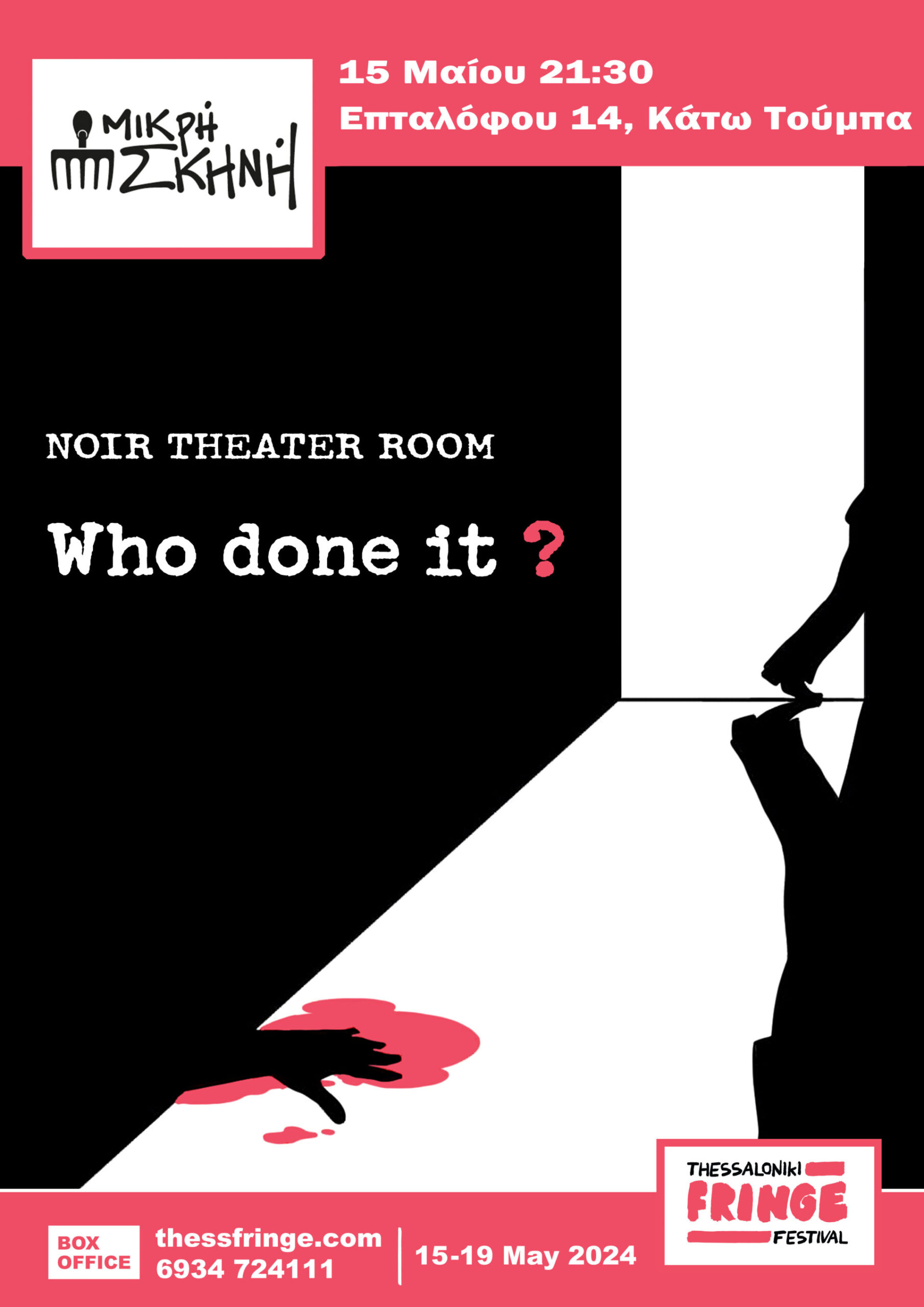 Την Τετάρτη 15 Μαΐου στις 21.30, στη “Μικρή Σκηνή”, όλοι ψάχνουν τον δολοφόνο, μαζί με τους “Noir Theater”, στο διαδραστικό τους έργο “Who done it”. Η εκδήλωση εντάσσεται στα πλαίσια του “Thessaloniki Fringe Festival”, ένα ανεξάρτητο φεστιβάλ παραστατικών τεχνών, που διοργανώνεται φέτος για δεύτερη χρονιά στην πόλη μας και φιλοξενεί 29 παραστάσεις από 10 διαφορετικές χώρες.