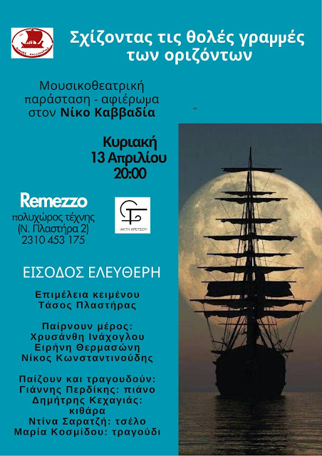 Η Δημοτική Εμπορική & Τουριστική Επιχείρηση Καλαμαριάς (ΔΕΤΕΚ ΑΕ ΟΤΑ) τιμά τον εμβληματικό ποιητή της θάλασσας, Νίκο Καββαδία, με ένα μοναδικό μουσικοθεατρικό αφιέρωμα με τίτλο «Σχίζοντας τις θολές γραμμές των οριζόντων». Η εκδήλωση πραγματοποιείται με αφορμή τη συμπλήρωση 50 χρόνων από τον θάνατο του αγαπημένου ποιητή και υπόσχεται ένα αξέχαστο ταξίδι στον κόσμο της ποίησης και της μουσικής.