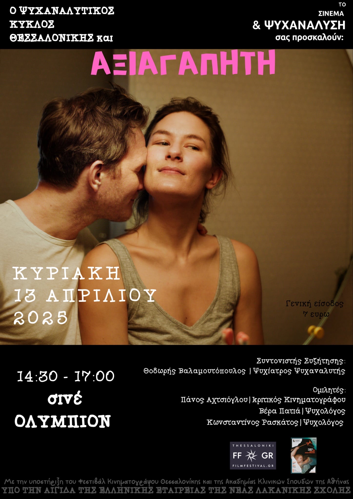 Ο Ψυχαναλυτικός Κύκλος Θεσσαλονίκης και η Ελληνική Εταιρεία της Νέας Λακανικής Σχολής (ΕΕ-ΝΛΣ), με την υποστήριξη της Ακαδημίας Κλινικών Σπουδών της Αθήνας (ΑΚΣΠΑ) και το Φεστιβάλ Κινηματογράφου Θεσσαλονίκης, διοργανώνουν στα πλαίσια του Σινεμά και Ψυχανάλυση και του ετήσιου συνεδρίου της Νέας Λακανικής Σχολής με θέμα «Οδυνηροί Έρωτες» (Μάιος 2025), την προβολή της ταινίας «Αξιαγάπητη» της Λίλια Ίνγκολφσντότιρ (2024).