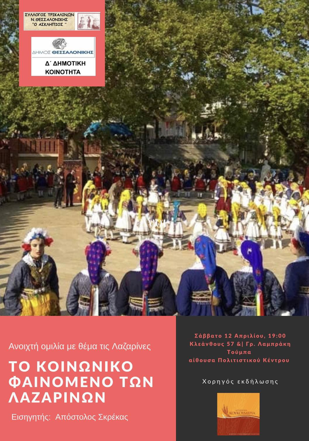 Ο Δήμαρχος Θεσσαλονίκης Στέλιος Αγγελούδης ο Αντιδήμαρχος Δημ. Κοινοτήτων & Γειτονιών & Μέριμνας για την Τρίτη Ηλικία Λάζαρος Ζαχαριάδης και η Πρόεδρος της Δ’ Δημοτικής Κοινότητας Ελευθερία Παπαθωμά σας προσκαλούν στην εκδήλωση «ΛΑΖΑΡΙΝΕΣ 2025» που συνδιοργανώνεται με το Σύλλογο Τρικαλινών Ν. Θεσσαλονίκης «Ο ΑΣΚΛΗΠΙΟΣ» το Σάββατο 12 Απριλίου στις 19:00 στο Αμφιθέατρο του Κέντρου Πολιτισμού Τούμπας (Γρ. Λαμπράκη και Κλεάνθους).