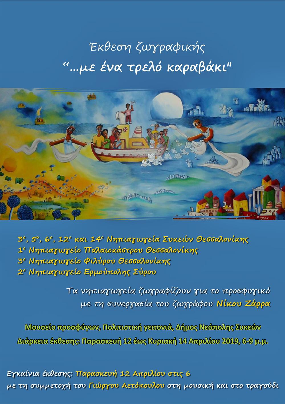 Την Παρασκευή 12 Απριλίου 2019, και ώρα 18.00 θα γίνουν τα εγκαίνια της έκθεσης ζωγραφικής με τίτλο «… με ένα τρελό καραβάκι», στο Μουσείο Προσφύγων, στην Πολιτιστική Γειτονιά του Δήμου Νεάπολης Συκεών. Στην έκθεση, η οποία αναφέρεται στο προσφυγικό ζήτημα, εκθέτουν τα έργα τους τα παιδιά των 3ου, 5ου, 6ου, 12ου και 14ου Νηπιαγωγείων Συκεών Θεσσαλονίκης, του 1ου Νηπιαγωγείου Παλαιοκάστρου Θεσσαλονίκης, του 3ου Νηπιαγωγείου Φιλύρου Θεσσαλονίκης και του 2ου Νηπιαγωγείου Ερμούπολης Σύρου, με τη συνεργασία του ζωγράφου Νίκου Ζάρρα. Μπορείτε να «ταξιδέψετε» μέσα από τις εικαστικές δημιουργίες των παιδιών, από την Παρασκευή 12 Απριλίου μέχρι και την Κυριακή 14 Απριλίου 2019 κατά τις ώρες 18.00-21.00. Τα εγκαίνια της έκθεσης θα συνοδεύσει με τη μουσική και τα τραγούδια του ο Γιώργος Αετόπουλος.