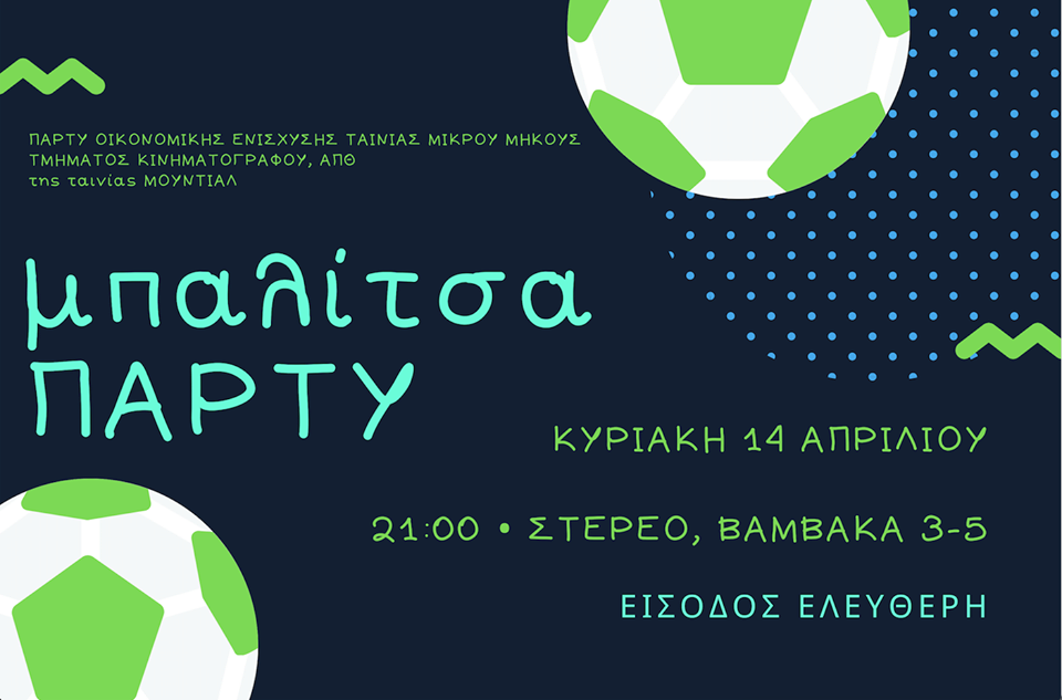 Το “Μουντιάλ” είναι η ταινία μικρού μήκους που αναπτύσσεται στο πλαίσιο μαθήματος, τελευταίου εργαστηρίου του Τμήματος Κινηματογράφου, ΑΠΘ από φοιτητές του τμήματος. Για τις ανάγκες υλοποίησης της ταινίας θα γίνει πάρτι οικονομικής ενίσχυσης στο ΣΤΕΡΕΟ (Βαμβακά 3-5) με ελεύθερη είσοδο.