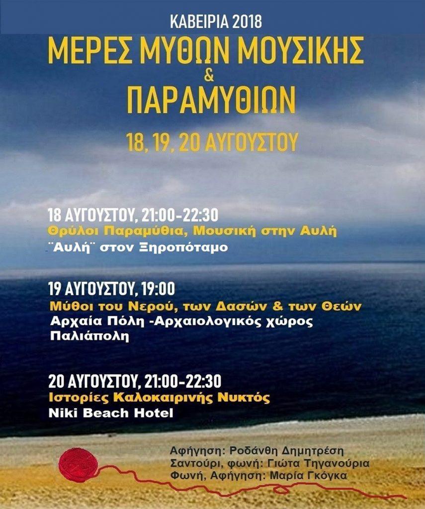”ΚΑΒΕΙΡΙΑ 2018”. Στο πλαίσιο των πολιτιστικών εκδηλώσεων του Δήμου Σαμοθράκης, η ΑctionArt για τρίτη χρονιά, διοργανώνει τις εκδηλώσεις ΜΕΡΕΣ ΜΥΘΩΝ ΜΟΥΣΙΚΗΣ & ΠΑΡΑΜΥΘΙΩΝ υπό την Αιγίδα και την υποστήριξη του Δήμου Σαμοθράκης, του Κέντρου Κοινότητας, www.samothraki.gr, τη χορηγία του Ηotel Niki Beach www.nikibeach.gr, την υποστήριξη της Μουσικής Ομάδας ”Ηχοϋφάντες”, και του συλλόγου Βιώσιμη Σαμοθράκη/Sustainable Samothraki http://sustainable-samothraki.net/el/.